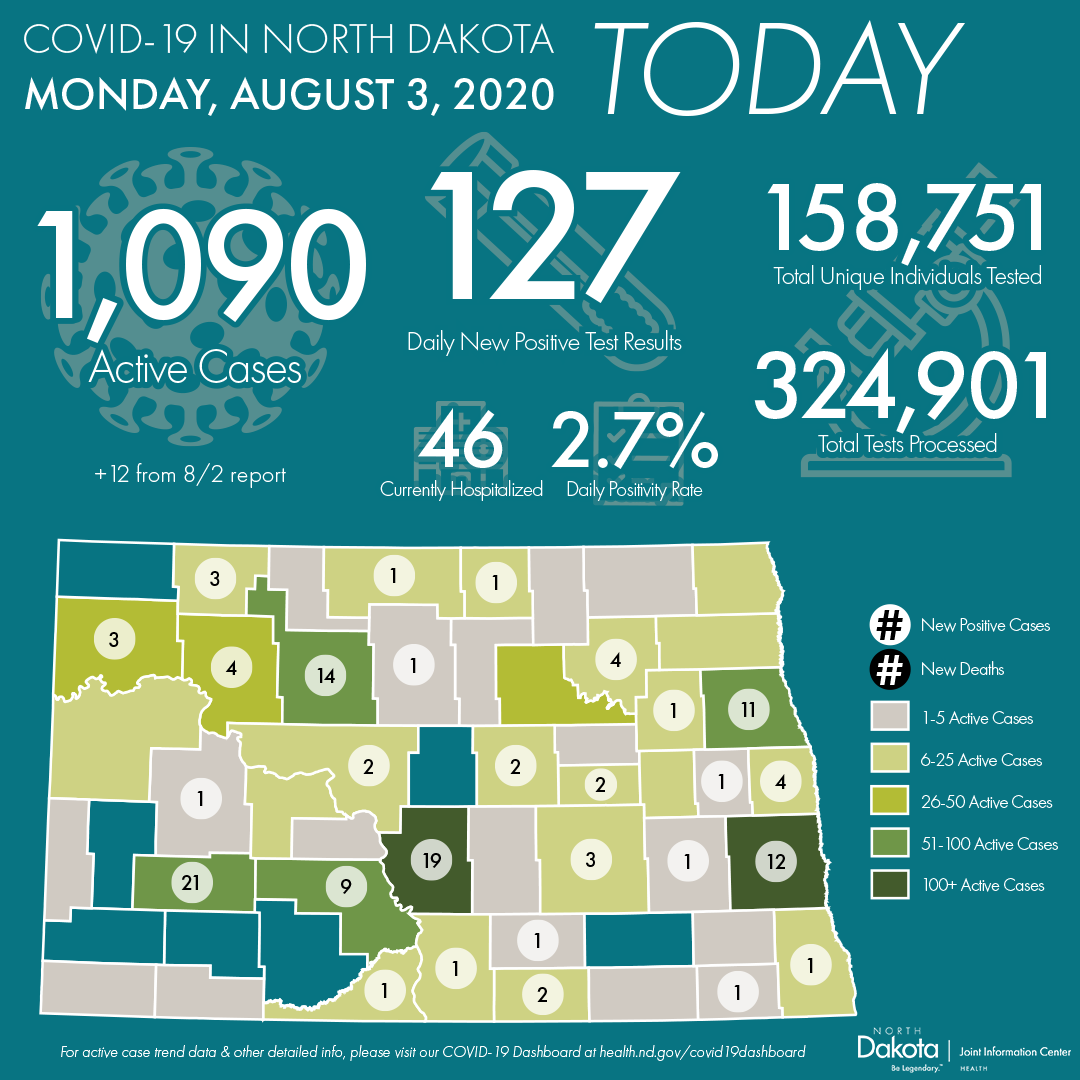 Nd Department Of Health On Twitter Covid 19 Daily Report August 3 4 723 Tests 1 728 6 785 Positives 127 5 590 Recovered 113 105 Deaths 0