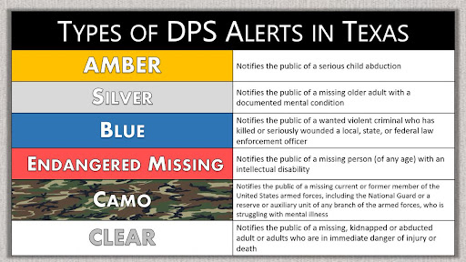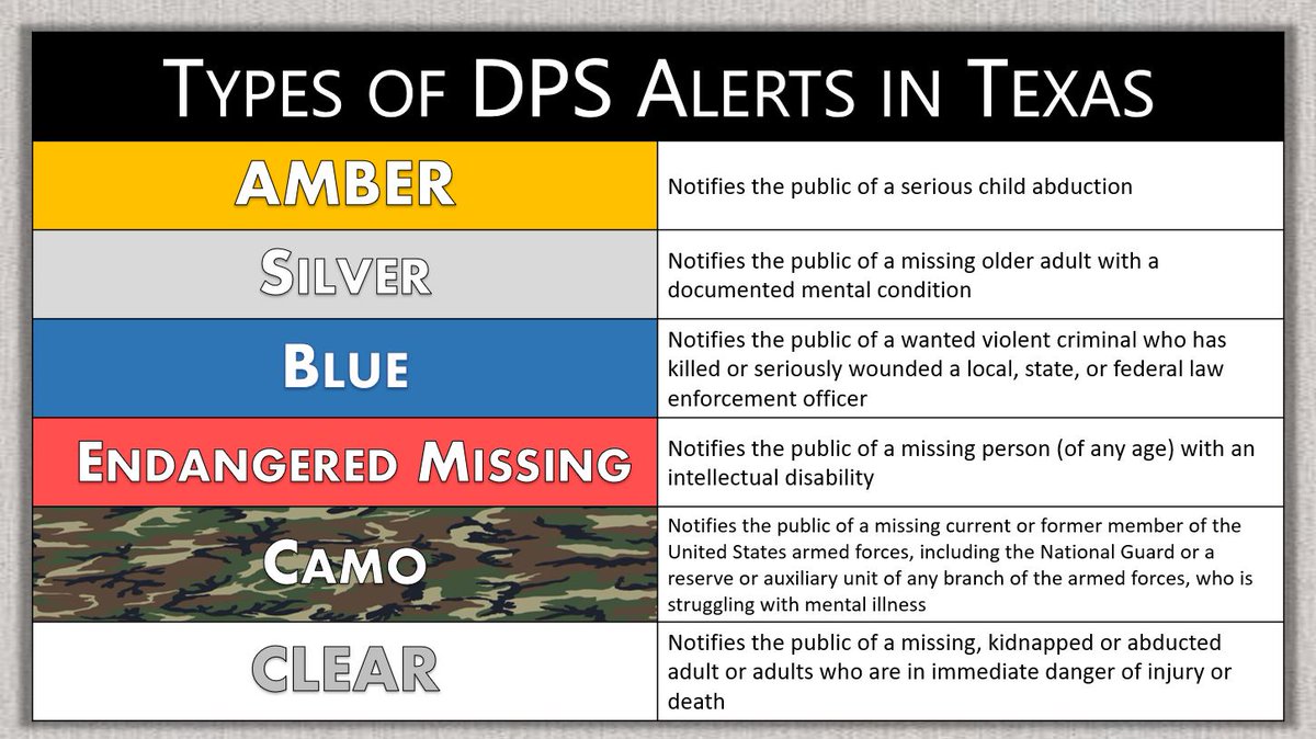 Frisco Police On Twitter Due To A Number Of Calls We Received About The Blue Alert Sent Out By Dps A Short Time Ago Please Review This Information There Are Six Types
